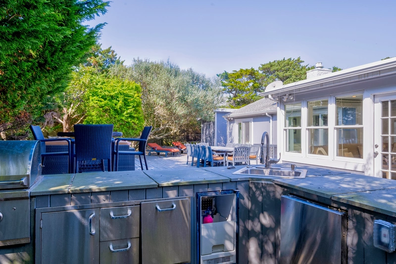 Two bedrooms and a bath sit on each side of the home, giving everyone privacy, while a third full bath ensures convenience for guests. Outdoors, a hot tub, summer kitchen, and generous deck space create the perfect setting for sunset dinners, stargazing, and long summer nights.